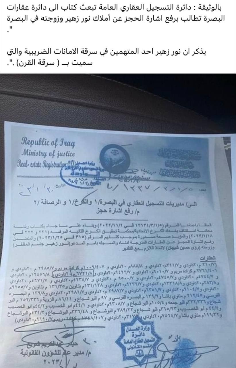ونشر عضو اللجنة النائب مصطفى سند ، عبر حسابه الشخصي في منصة فيسبوك للتواصل الاجتماعي ، وثيقة رسمية صادرة عن مديرية التسجيل العقاري الى دائرة عقارات البصرة تطالب برفع شارة الحجز عن املاك المتهم المكفل " نور زهير " وزوجته في محافظة البصرة ، مؤكدا ان الاخير متواجد حاليا في مدينة دبي.