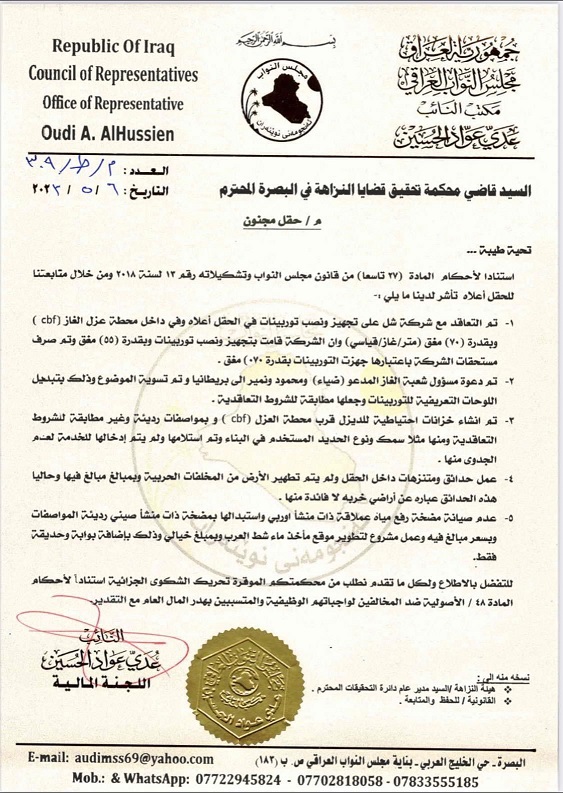 قدم النائب عدي عواد طلبا نيابيا إلى قاضي النزاهة في البصرة بخصوص وجود فساد في حقل مجنون النفطي