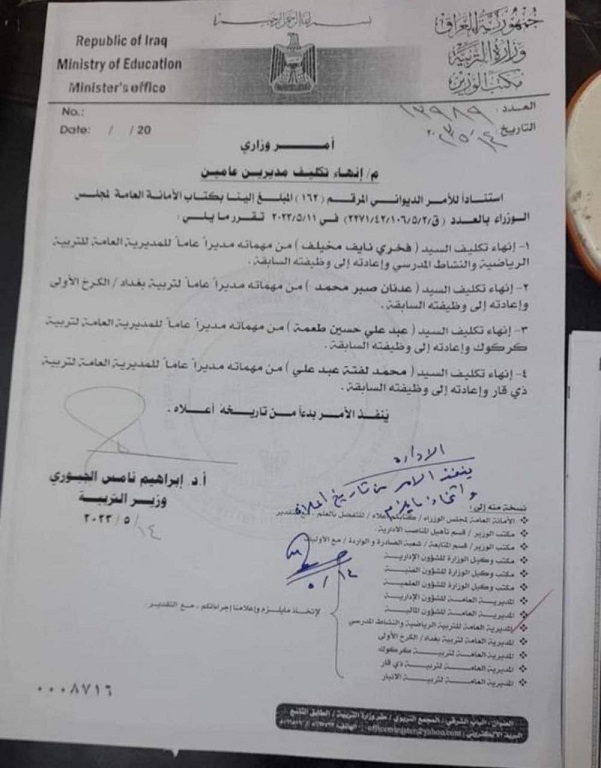 وبحسب وثيقة فإنه "تقرر إنهاء تكليف فخري نايف مخيلف من مهامه مديراً عاماً للمديرية العامة للتربية الرياضية والنشاط المدرسي وإعادته إلى وظيفته السابقة، بالإضافة الى إنهاء تكليف عدنان صبر محمد من مهماته مديراً عاماً لتربية بغداد / الكرخ الأولى وإعادته إلى وظيفته السابقة".