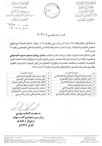 وبحسب وثيقة فإن "تقرر تشكيل لجنة نيابية مؤقتة برئاسة النائب عدنان الجحيشي لمتابعة التوصيات الخاصة بمكافحة المخدرات والمؤثرات العقلية".