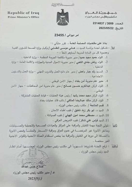 وبحسب وثيقة فإنه "بناءً على مقتضيات المصلحة العامة، تقرر تشكيل لجنة، برئاسة وكيل وزارة الصحة للشؤون الفنية،هاني موسى العقابي، تتولى مهمة التفتيش والمراقبة على مراكز والعيادات الصحية والتجميلية والصيدليات ومذاخر الادوية، غير المرخصة، في عموم العراق، ومراقبة الأسعار والمنشأ وفحص الأدوية، بالإضافة الى دورها في التفتيش والمراقبة بما يخص استقدام العمالة الأجنبية والكوادر الأجنبية غير المختصة".