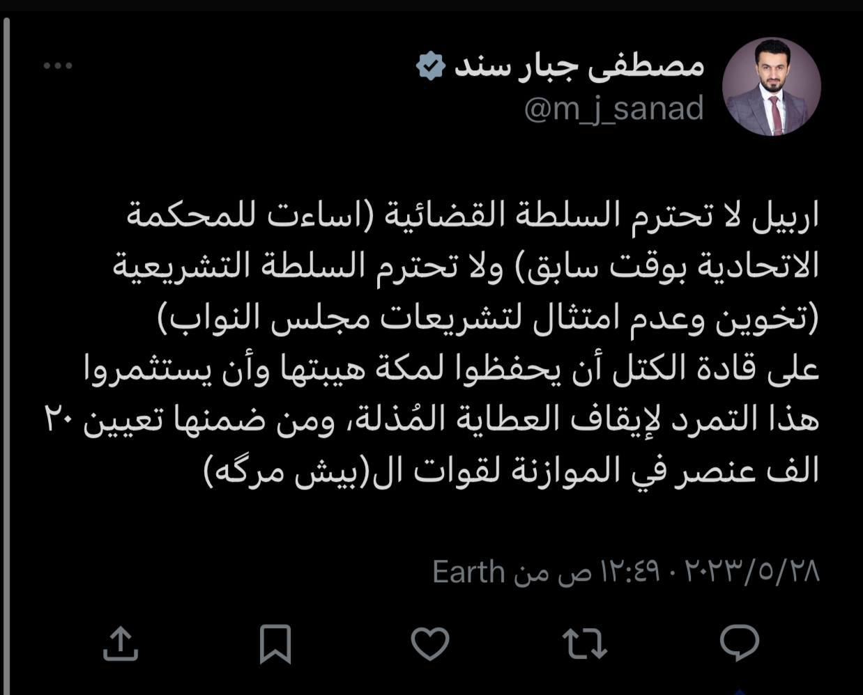 في تغريدة له .... النائب المستقل مصطفى سند : اربيل لا تحترم السلطة القضائية ولا تحترم السلطة التشريعية