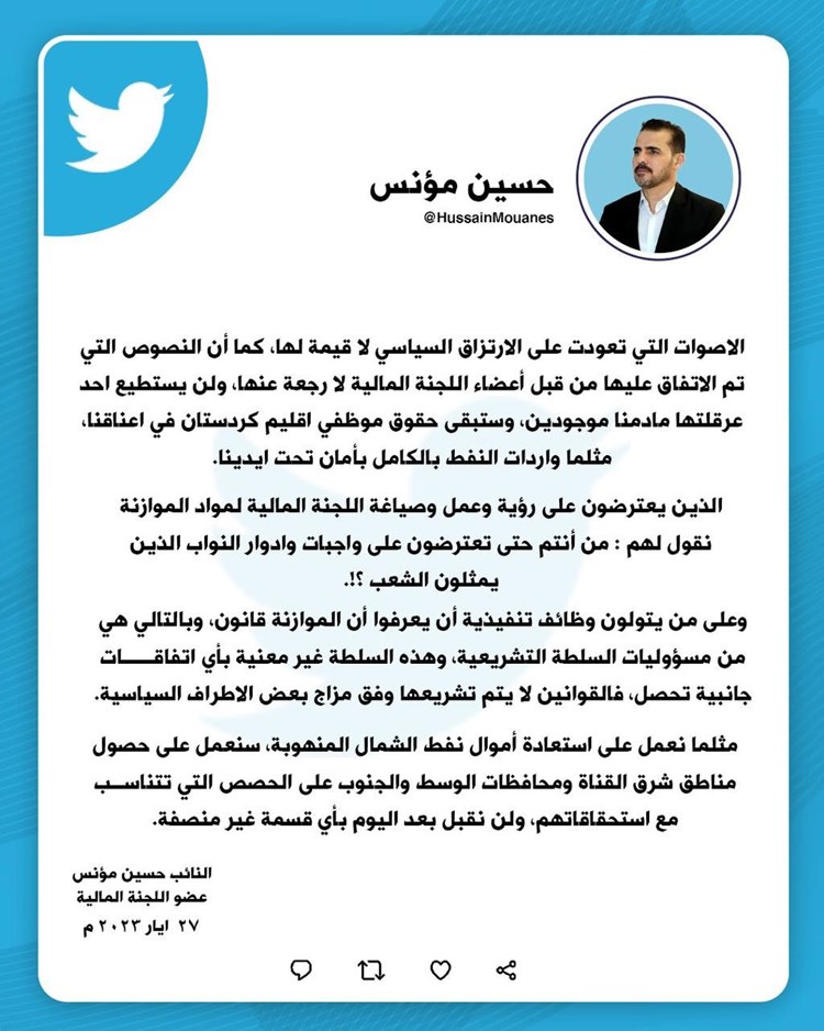 في تغريدة له ... النائب حسين مؤنس: النصوص المتفق عليها في اللجنة المالية لارجعة فيها
