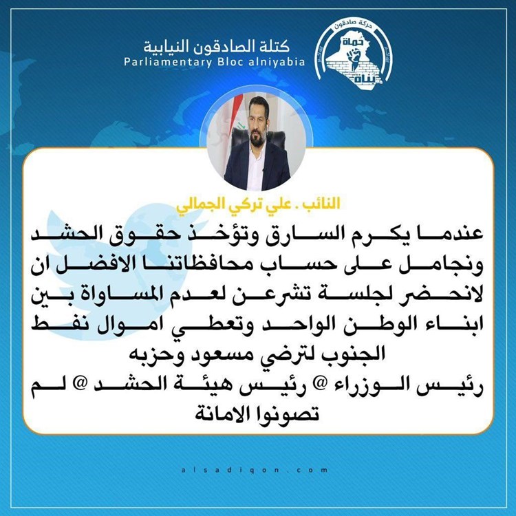الجمالي: كُرم السارق واُخذت حقوق الحشد الشعبي ..الافضل مقاطعة الجلسة ..