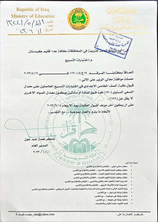 وبحسب وثيقة وردت من وزارة التربية، فإنه "إلحاقاً بكتابنا المرقم 19 ع / 5 / 11200 في 16 / 5 / 2023، حصلت موافقة وزير التربية على قبول طلبة صف الخامس الاعدادي في اختبارات التسريع الحاصلين على معدل سعي السنوي (90%) فما فوق لمادة أو مادتين، ويكون المعدل المواد الأخرى لا يقل عن (96 %).