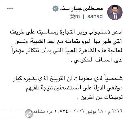 وقال سند، في تغريدة على {تويتر} :"ادعو لاستجواب وزير التجارة ومحاسبته على طريقته التي ظهر بها اليوم بتعامله مع احد الشيبة، وندعو لمعالجة هذه الظاهرة المعيبة التي بدأت تتكاثر مؤخراً لدى الستاف الحكومي".