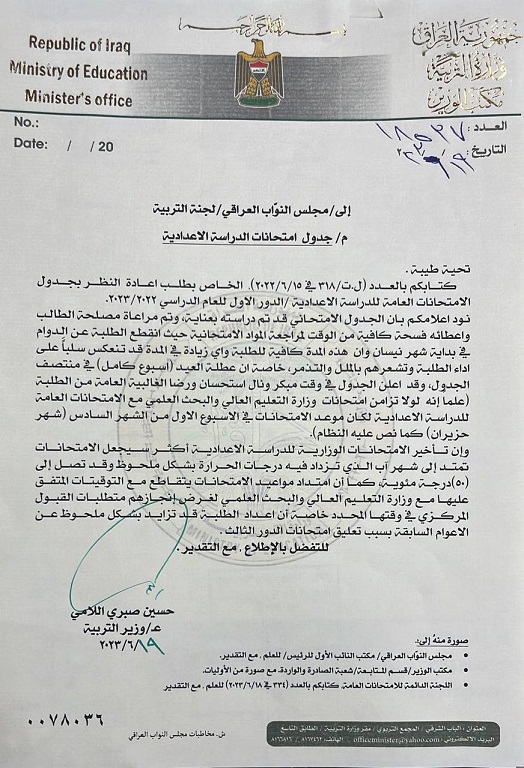 حسمت وزارة التربية، اليوم الاثنين، الجدل حول تأجيل امتحانات السادس الاعدادي، فيما اشارت الى انها فسحة كافية من الوقت للطلاب لمراجعة المواد الامتحانية.