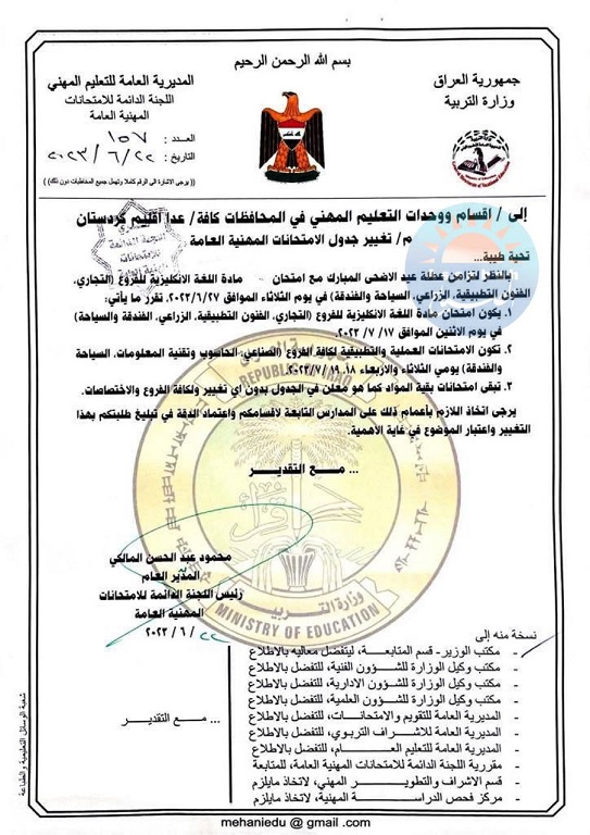 وبحسب وثيقة فإنه "بالنظر لتزامن عطلة العيد الأضحى المبارك مع امتحان مادة اللغة الإنكليزية للفروع (التجاري – الفنون التطبيقية – الزراعي – السياحة والفندقة) في يوم الثلاثاء الموافق 27/6/2023، تقرر ما يلي: ـ