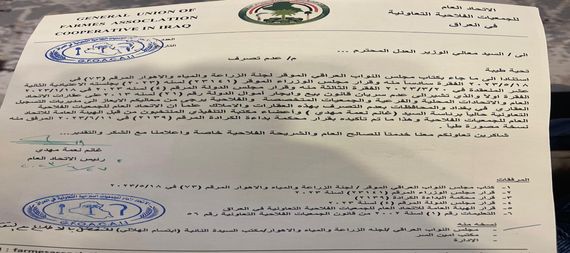 وأضافت أن "قرارات المحكمة الاتحادية التي صدرت اعتبرت انتخابات الهيئة العامة لاتحاد الجمعيات الفلاحية صحيحة، وعلى الهيئة السابقة تسليم رئاسة الاتحاد إلى الهيئة المنتخبة"، مشيرة إلى أن "رئيس الهيئة عماد كاظم يرفض تسليم المنصب ومبنى الاتحاد إلى الهيئة الجديدة واستخدم نفوذه السياسي وطلب قوة من وزارة الداخلية لحماية المقر ومنع الهيئة المنتخبة من الدخول إلى مقر الهيئة".