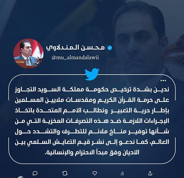 ادان النائب الاول لرئيس مجلس النواب محسن المندلاوي، اليوم الخميس، ترخيص حكومة السويد التجاوز على حرمة القرآن الكريم ومقدسات ملايين المسلمين بإطار حرية التعبير