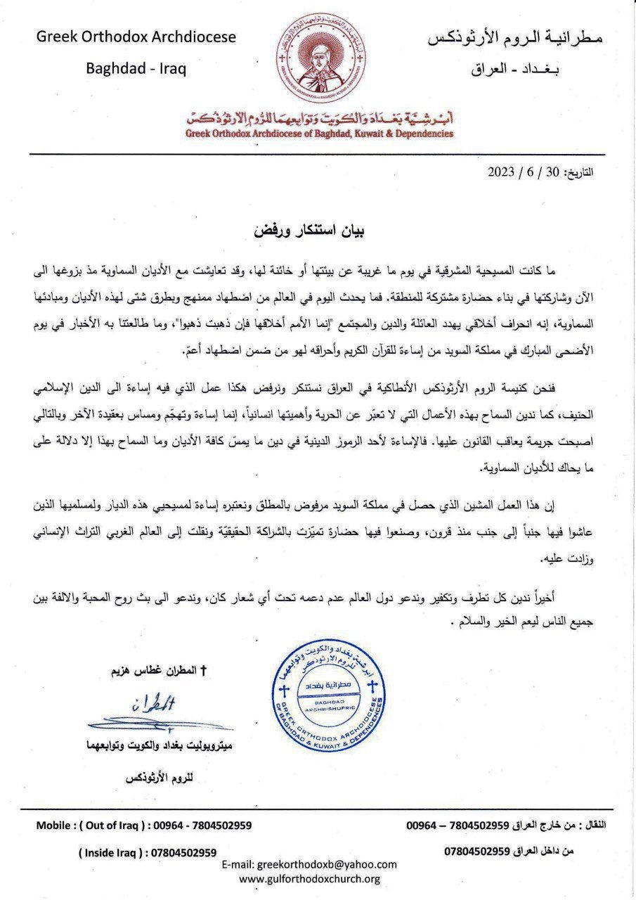 استنكرت كنيسة الروم الارثوذكس الانطاكية في العراق حرق المصحف الشريف في السويد