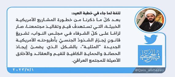 دعا الأمين العام لعصائب أهل الحق الشيخ قيس الخزعلي الى تشريع قانون يجرم الشذوذ الجنسي بأطروحته الامريكية .