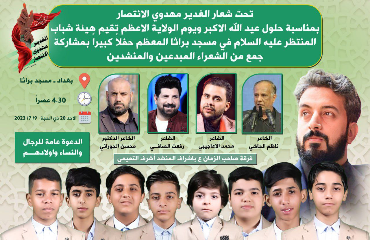وبمناسبة حلول عيد اللّه الأكبر ويوم الولاية الاعظم تقيم هيأة شباب المنتظر (عليه السلام) في مسجد براثا المعظَّم حفلًا بهيجًا بمشاركة جمع من الشعراء المبدعين والمنشدين