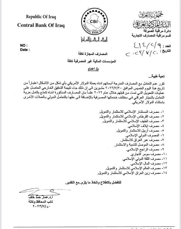 أصدر البنك المركزي العراقي، اليوم الخميس 20 تموز/ يوليو 2023، توضيحاً بشأن حرمان بعض المصارف العراقية من التعامل بالدولار، وذلك بعد العقوبات التي فرضتها وزارة الخزانة الامريكية، على 14 مصرفاً عراقيا.
