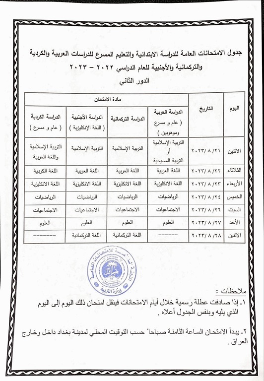 وبحسب وزارة التربية، فإن يوم الاثنين الموافق ٢٠٢٣/٨/٢١ موعداً لانطلاق الامتحانات العامة / الدور الثاني للصف السادس الابتدائي والثالث المتوسط .