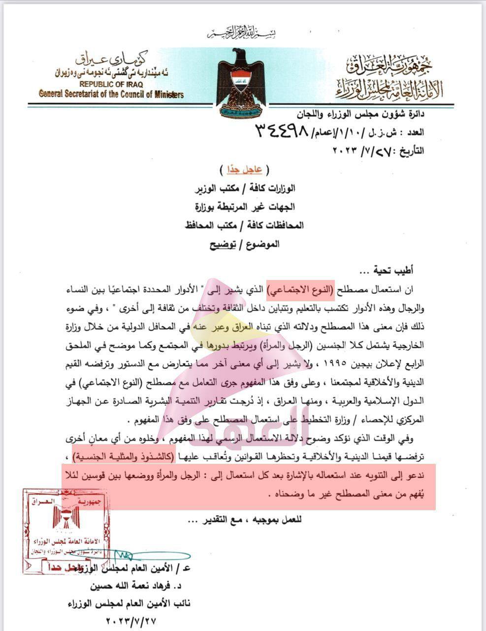 واضاف بل استطيع ان أؤكد على ان التعريف الذي قدمته في بداية بيانها كان هو المعنى المحذور والمذموم منه تماما، وهو عين ما سبق لمنظري الجندر ومؤسسي مقولته ان عرفوه، ولكن كان بإمكانهم أن يصدروا تعميماً يمنعون بموجبه دوائر الدولة من العمل بكل ما يخالف ثوابت الاسلام في اعتبار الاسرة مكونة من امرأة ورجل فحسب وفقا لما ورد في الدستور العراقي النافذ.