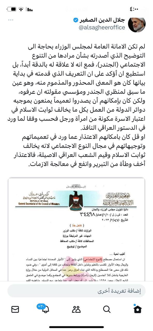 وقال سماحته في تغريدة له لم تكن الامانة العامة لمجلس الوزراء بحاجة الى التوضيح الذي أصدرته بشأن مرادها من التنوع الاجتماعي (الجندر)، فمع انه لا علاقة له بالدقة أبداً،