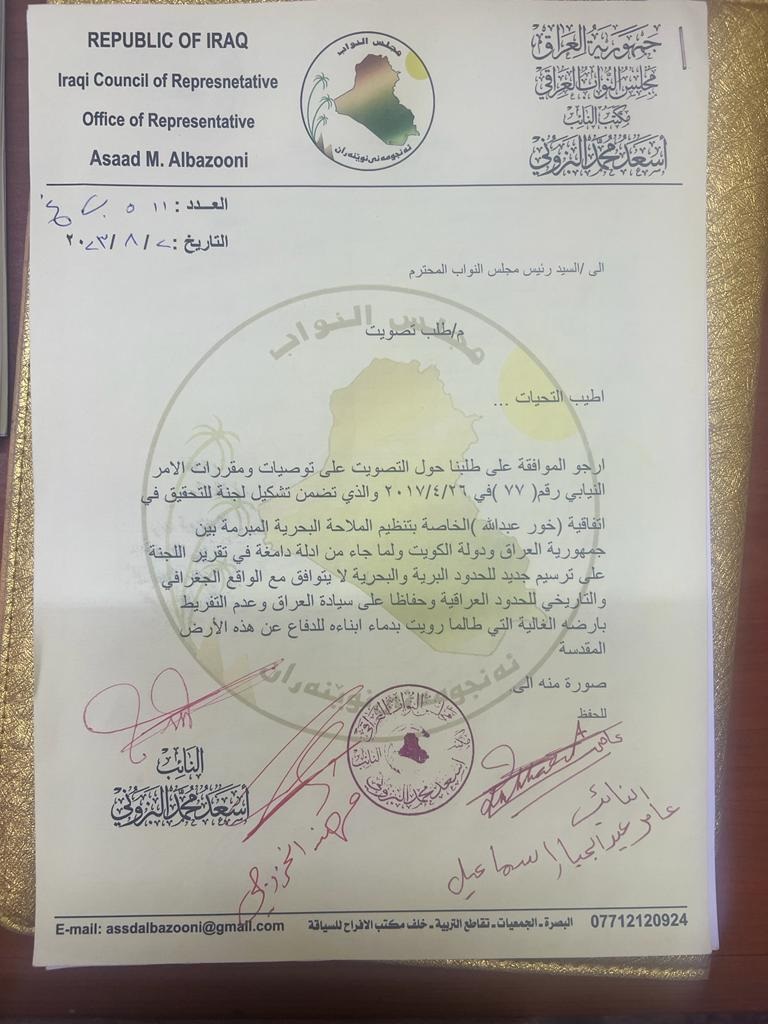 جمع عدد من اعضاء مجلس النواب والذين يشكلون قرابة ربع اعضاء المجلس، تواقيع للتصويت على مقررات لجنة الامر النيابي الخاصة بالتحقيق في اتفاقية خور عبد الله، والتي اثبتت وجود تغييرات وتجاوزات على حقوق العراق فيما يخص الحدود البرية والبحرية بما لايتوافق مع الوقائع التاريخية.