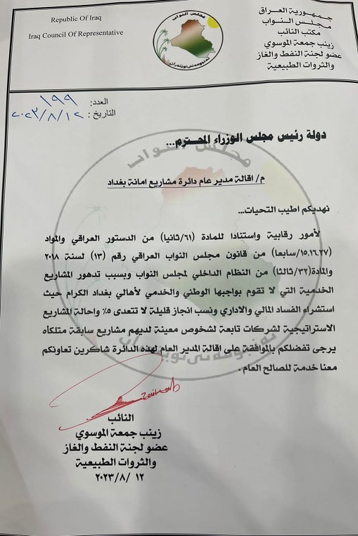 قدمت لجنة النفط والغاز والثروات الطبيعية النيابية ، طلبا رسميا الى رئيس مجلس الوزراء لإقالة مدير عام دائرة مشاريع امانة بغداد، بسبب تدهور المشاريع الخدمية واستشراء الفساد المالي والاداري.
