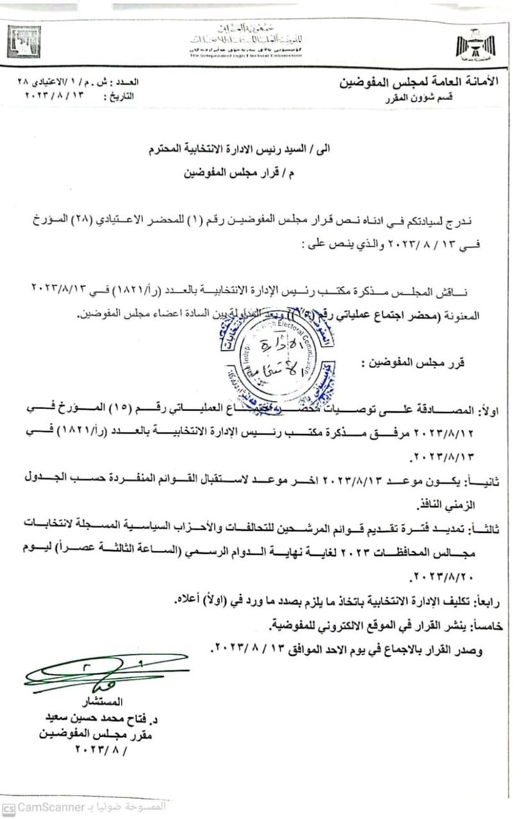 وبحسب وثيقة صادرة عن المفوضية، فإنه تقرر تمديد فترة تقديم قوائم المرشحين للتحالفات والأحزاب السياسية المسجلة لانتخابات مجالس المحافظات 2023 لغاية نهاية الدوام الرسمي في الساعة 3 عصراً ليوم 20 اب 2023".