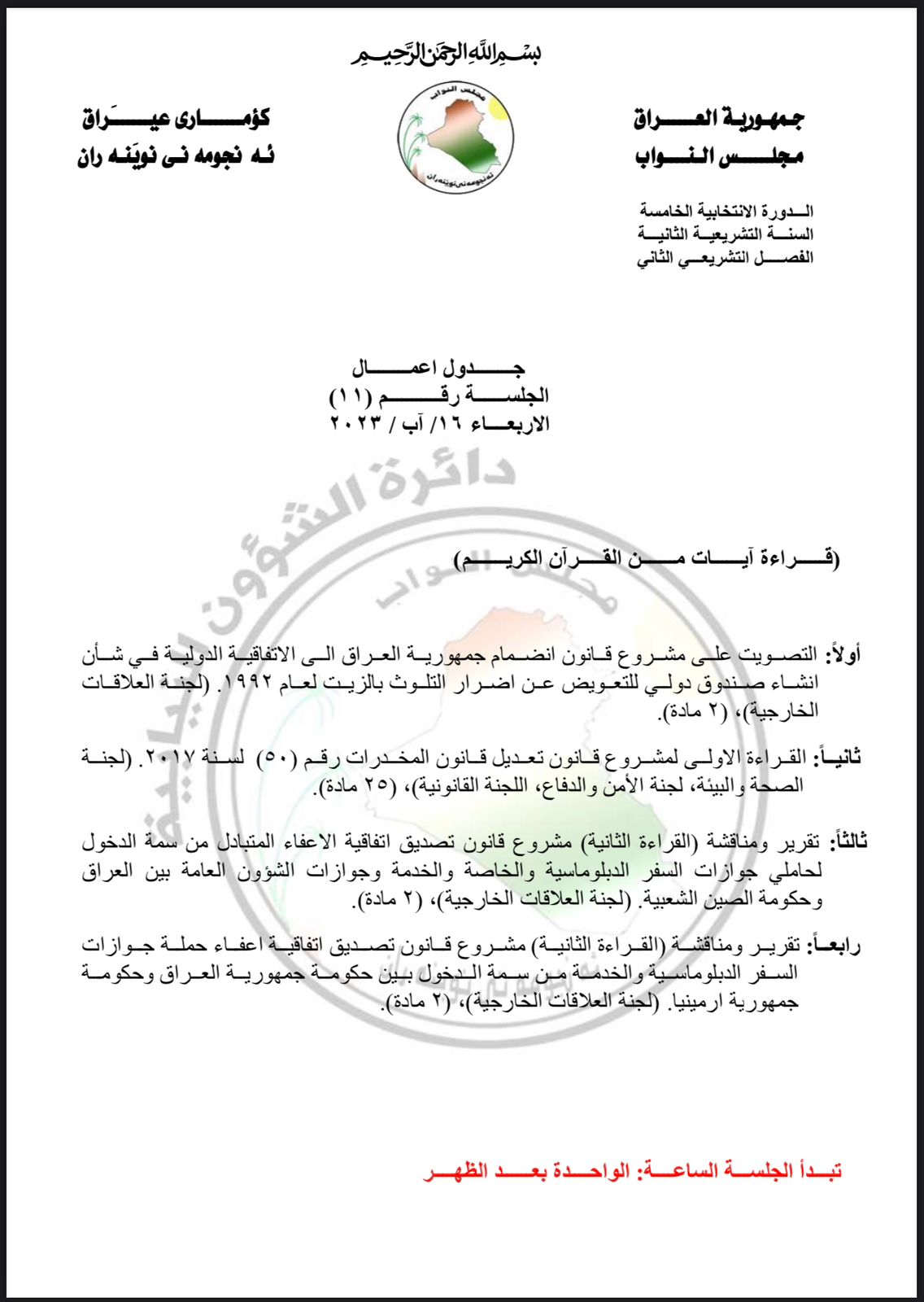 جدول أعمال البرلمان ليوم غد