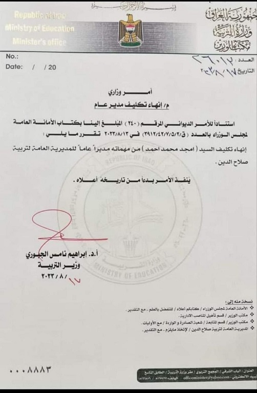 اصدر وزير التربية الدكتور إبراهيم نامس الجبوري امرا وزاريا باعفاء مدير عام تربية صلاح الدين أمجد محمد احمد من منصبه