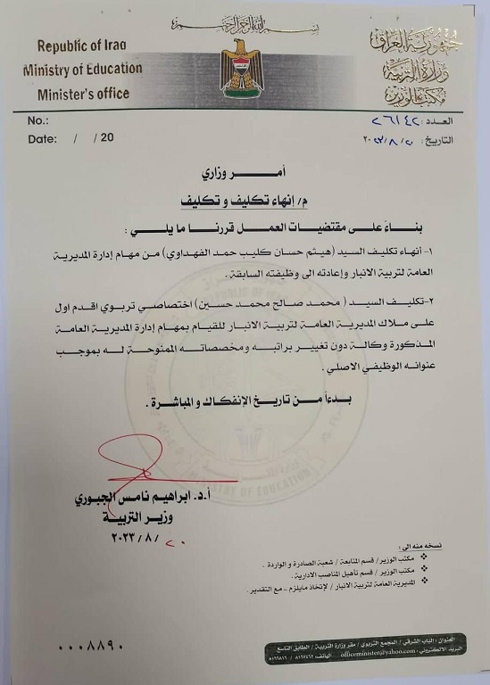 اصدر وزير التربية ابراهيم نامس الجبوري امرا وزاريا بإنهاء تكليف مدير تربية الانبار هيثم حسان ، وتكليف المشرف التربوي محمد صالح محمد بادارة المديرية.
