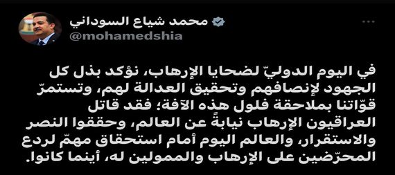 وقال السوداني في تغريدة له "في اليوم الدوليّ لضحايا الإرهاب، نؤكد بذل كل الجهود لإنصافهم وتحقيق العدالة لهم، وتستمرّ قوّاتنا بملاحقة فلول هذه الآفة".