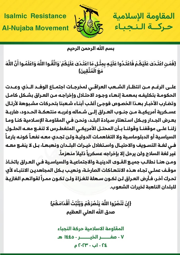 وقالت الحركة في بيان انه "على الرغم من انتظار الشعب العراقي لمخرجات اجتماع الوفد الذي وعدت الحكومة بتكليفه بمهمة إنهاء وجود الاحتلال وإخراجه من العراق بشكل كامل وتضارب الأخبار بهذا الخصوص فوجئ أغلب أبناء شعبنا بتحركات مشبوهة لأرتال عسكرية أمريكية من جنوب العراق إلى شماله وغربه منتهكة الحدود، ضاربة بعرض الجدار وبكل استهتار سيادة البلد، ونحن في المقاومة الإسلامية كنا وما زلنا على موقفنا وقولنا بأن المحتل الأمريكي المتغطرس لا تنفع معه الحلول السياسية أو الدبلوماسية ولا التفاهمات الدولية ولن تجدي معه نفعاً كونه بارعاً في لغة التسويف والاحتيال واستغلال خيرات البلدان ونهبها، بل لا ينفع معه غير لغة السلاح ولن يرحل إلا بإخراجه عسكرياً ذليلاً منهزماً".