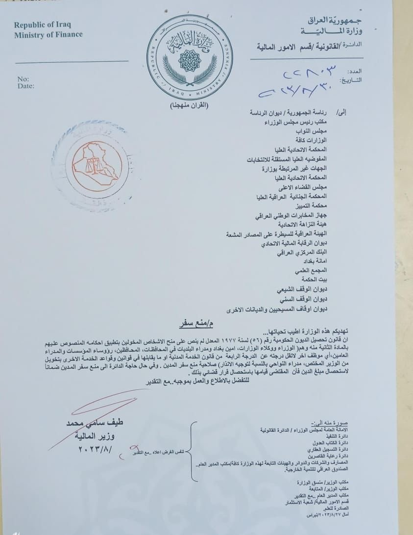 وذكرت الوزارة في كتاب رسمي، يخص منع السفر، أن "قانون تحصيل الديون الحكومية رقم (56) لسنة 1977 المعدل لم ينص على منح الأشخاص المخولين بتطبيق أحكامه المنصوص عليهم بالمادة الثانية منه، صلاحية منع سفر المَدين".
