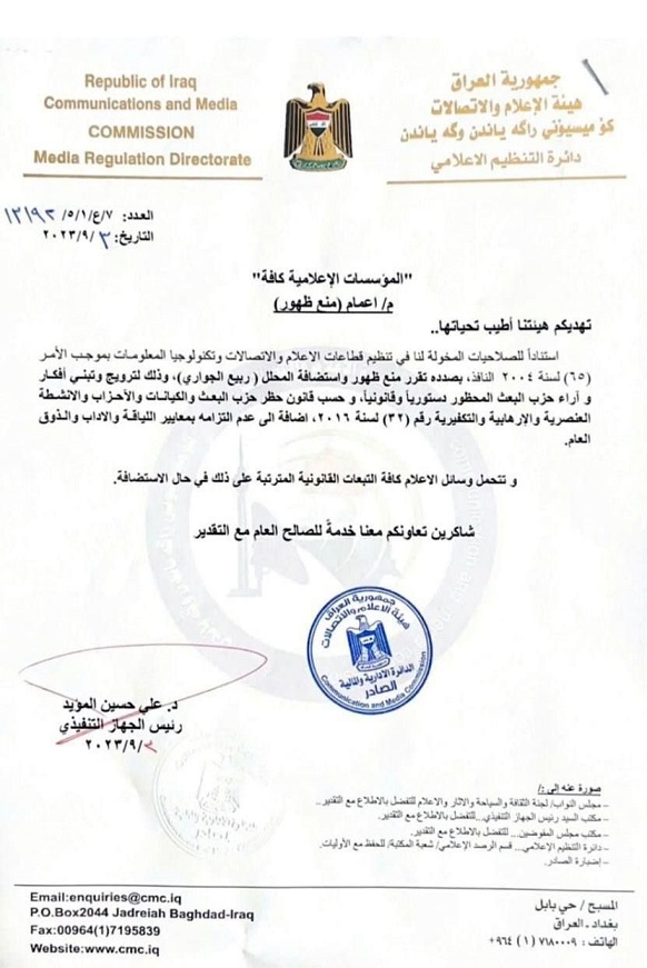 منعت هيئة الإعلام والاتصالات، ظهور المحلل "ربيع الجواري" في المؤسسات الإعلامية كافة لـ "ترويجه وتبنيه أفكار حزب البعث".