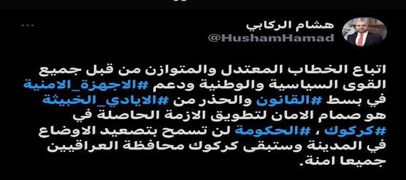 وقال الركابي على تويتر: اتباع الخطاب المعتدل والمتوازن من قبل جميع القوى السياسية والوطنية ودعم الاجهزة الامنية في بسط القانون والحذر من الايادي الخبيثة هو صمام الامان لتطويق الازمة الحاصلة في كركوك ،.. الحكومة لن تسمح بتصعيد الاوضاع في المدينة وستبقى كركوك محافظة العراقيين جميعا امنة.