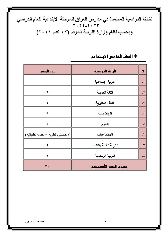 وقالت التربية في بيان ان "المديرية العامة للمناهج، اعلنت عن جدول الحصص الدراسية المعتمد للدراسة الابتدائية داخل المؤسسات التربوية في عموم العراق للعام الدراسي (٢٠٢٣_٢٠٢٤)".