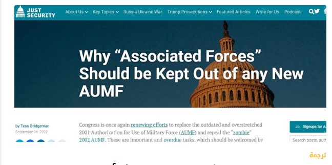 واوضح التقرير ان " أي تفويض جديد لاستخدام القوة العسكرية يجب أن يقتصر على الجماعات المسلحة غير الحكومية المحددة بوضوح والتي صوت الكونغرس لصالح التفويض بالحرب ضدها، كما يجب أن يوضح أن السلطة التي يمنحها للرئيس لشن الحرب لا تمتد إلى "المرتبطين بها " أو "بما بعدها " أو "التابعين" أو القوى الأخرى التي لم يصوت الكونغرس ضدها على استخدام القوة".