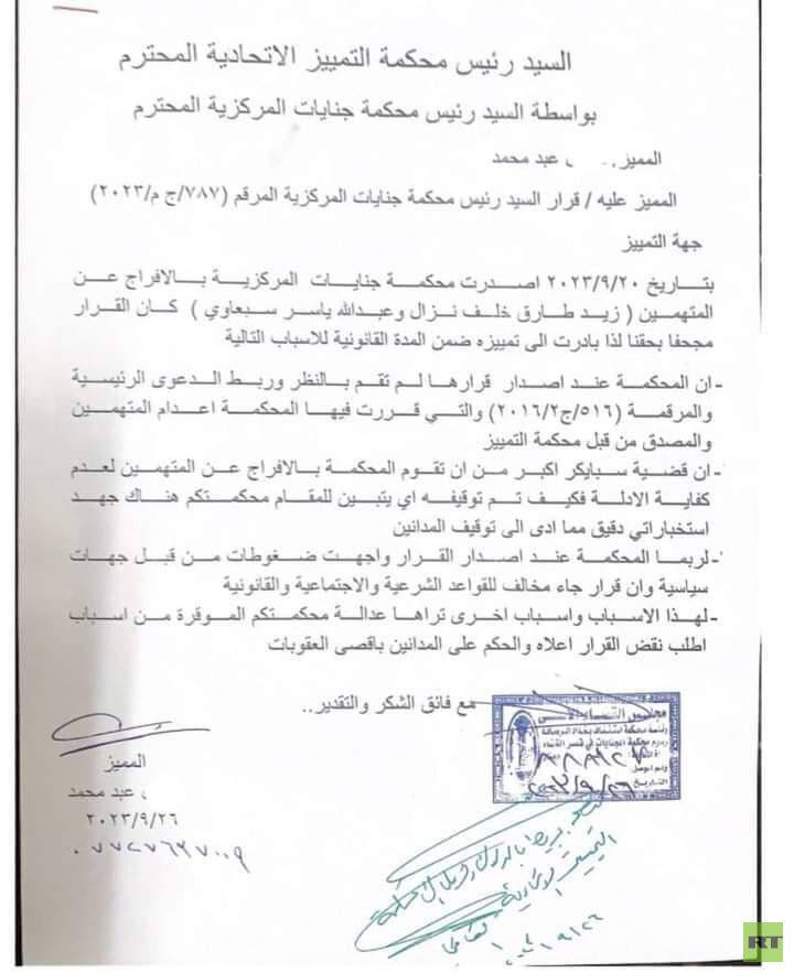وأظهرت وثيقة مقدمة إلى رئيس محكمة التمييز الاتحادية تعتبر أن قرار تبرئة سراح (عبد الله ياسر سبعاوي) الحفيد للأخ غير الشقيق لصدام حسين، مجحفا بحق عائلات الضحايا.