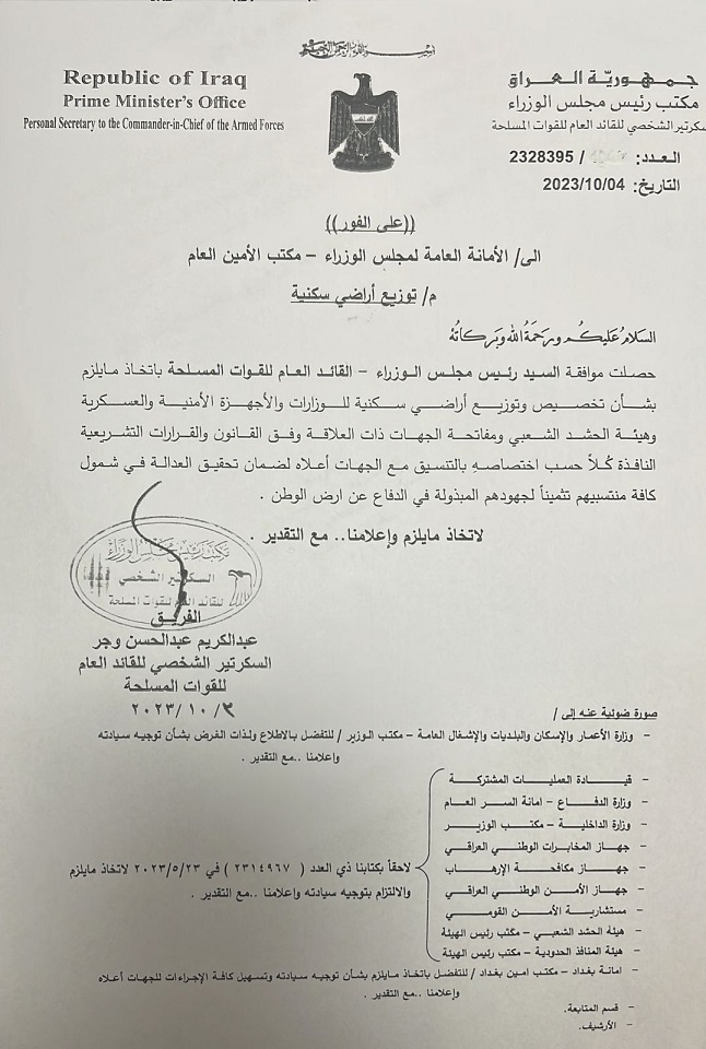 نشرت وثيقة صادرة من مكتب رئيس مجلس الوزراء محمد شياع السوداني تبين موافقته على تخصيص وتوزيع قطع أراض سكنية لمنتسبي القوات الأمنية والحشد الشعبي.