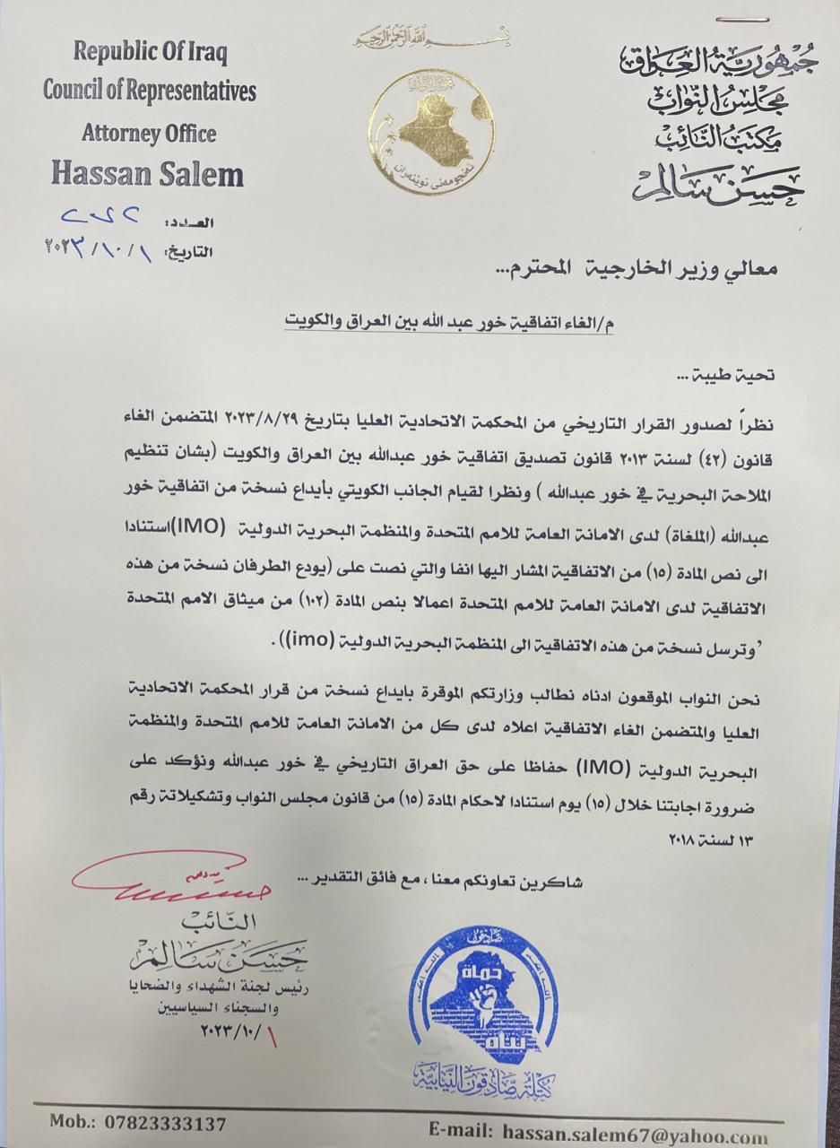 وقع اكثر من 100 نائب ، طلبا رسميا يتضمن مطالبة وزير الخارجية بأيداع نسخة من قرار المحكمة الاتحادية الخاصة بألغاء اتفاقية خور عبد الله بين العراق والكويت، لدى كل من الامانة العامة للامم المتحدة والمنظمة البحرية الدولية (IMO) .