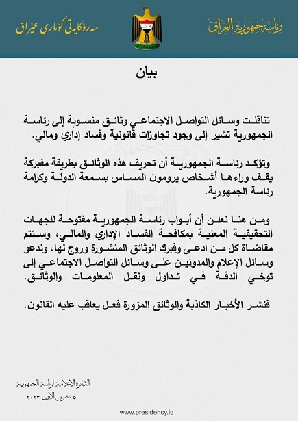 نفت رئاسة الجمهورية ما تناقلته وسائل التواصل الاجتماعي عن وجود وثائق تشير الى وجود تجاوزات قانونية وفساد مالي واداري في الرئاسة وقالت الدائرة الاعلامية لرئاسة الجمهورية في بيان :" تناقلت وسائل التواصل الاجتماعي وثائق منسوبة الى رئاسة الجمهورية تشير الى وجود تجاوزات قانونية وفساد مالي واداري ".