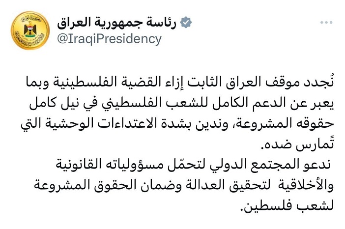 وقالت رئاسة الجمهورية في منشور على منصة "أكس": "نُجدد موقف العراق الثابت إزاء القضية الفلسطينية وبما يعبر عن الدعم الكامل للشعب الفلسطيني في نيل كامل حقوقه المشروعة، وندين بشدة الاعتداءات الوحشية التي تًمارس ضده".