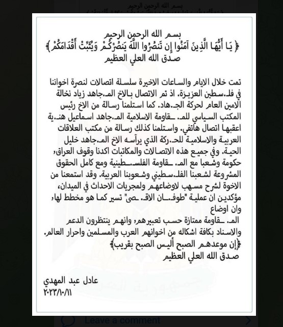 خلال اتصاله بقادة المقاومة الاسلامية الفلسطينية .... السيد عادل عبد المهدي أوضاع المقاومة ممتازة