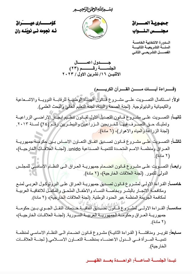 ونشرت الدائرة الإعلامية لمجلس النواب بحسب وثيقة جدول اعمال الجلسة الثالثة والعشرين من الدورة الانتخابية الخامسة، السنة التشريعية الثانية، الفصل التشريعي الثاني".
