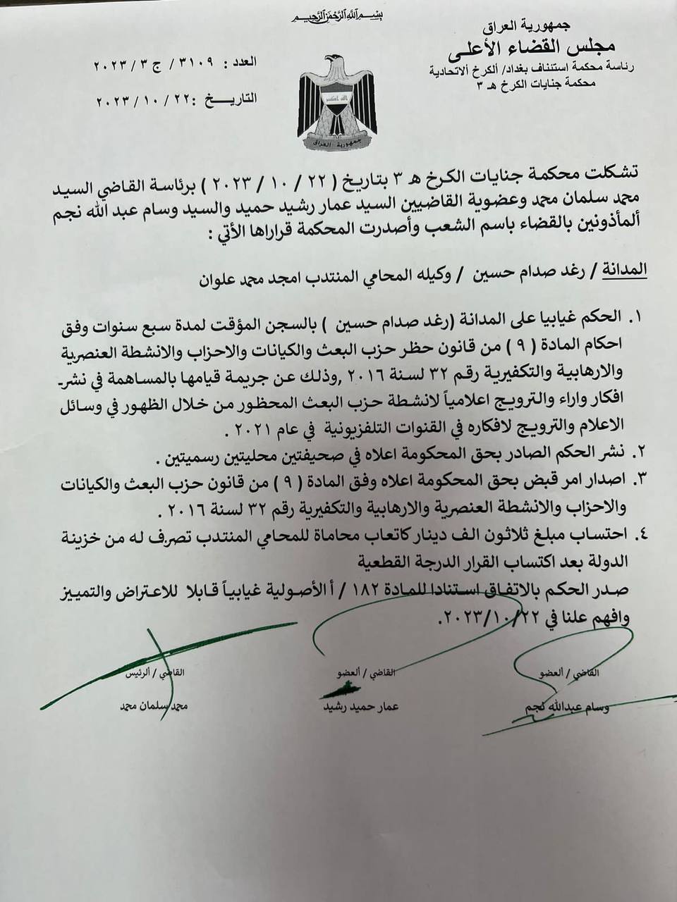 اصدرت محكمة جنايات الكرخ حكما غيابيا بالسجن سبعة سنوات على المدانة رغد صدام حسين لقيامها بنشر افكار حزب البعث الصدامي المقبور من خلال مواقع التواصل الاجتماعي او المقابلات الصحفية