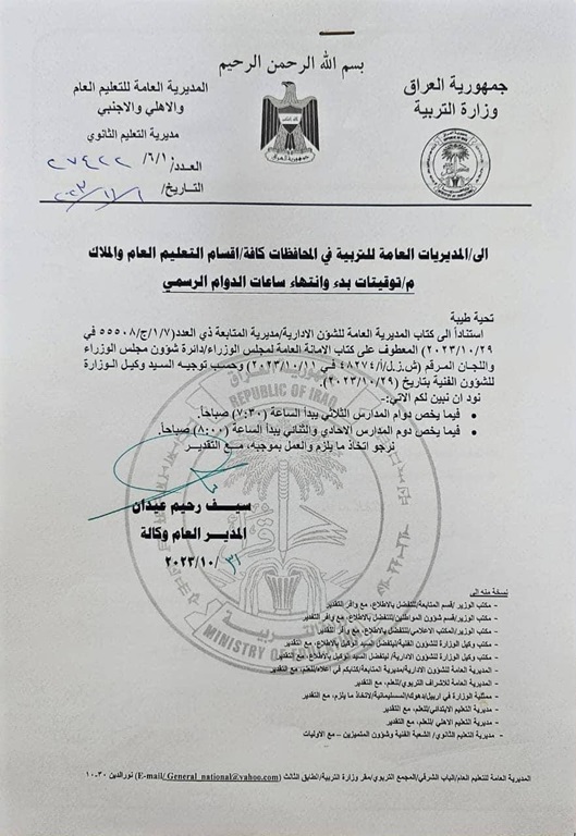 حددت وزارة التربية، اليوم الأربعاء، توقيتات بدء الدوام الرسمي بجميع مدارس العراق، عدا محافظات إقليم كردستان.