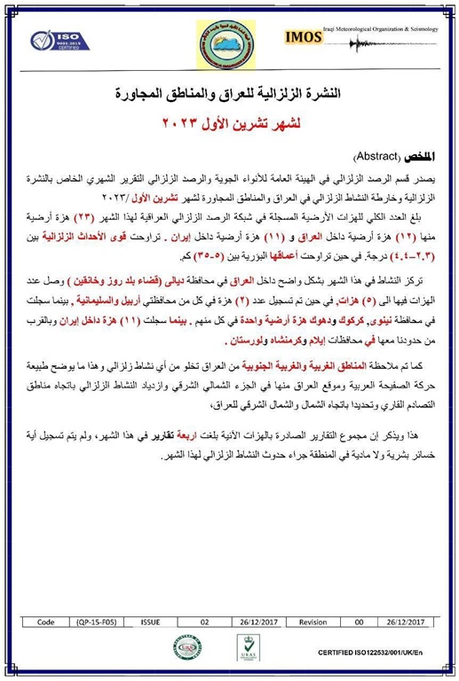 وذكرت الهيئة، في بيان أن "العدد الكلي للهزات الأرضية المسجلة في شبكة الرصد العراقي لشهر تشرين الأول بلغ 23، منها 12 هزة أرضية داخل العراق و11 هزة في إيران".