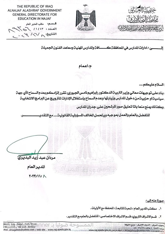 اعلنت مديرية تربية النجف الأشرف عن امتناعها عن استقبال مرشحي الانتخابات القادمة في مؤسساتها التربوية .