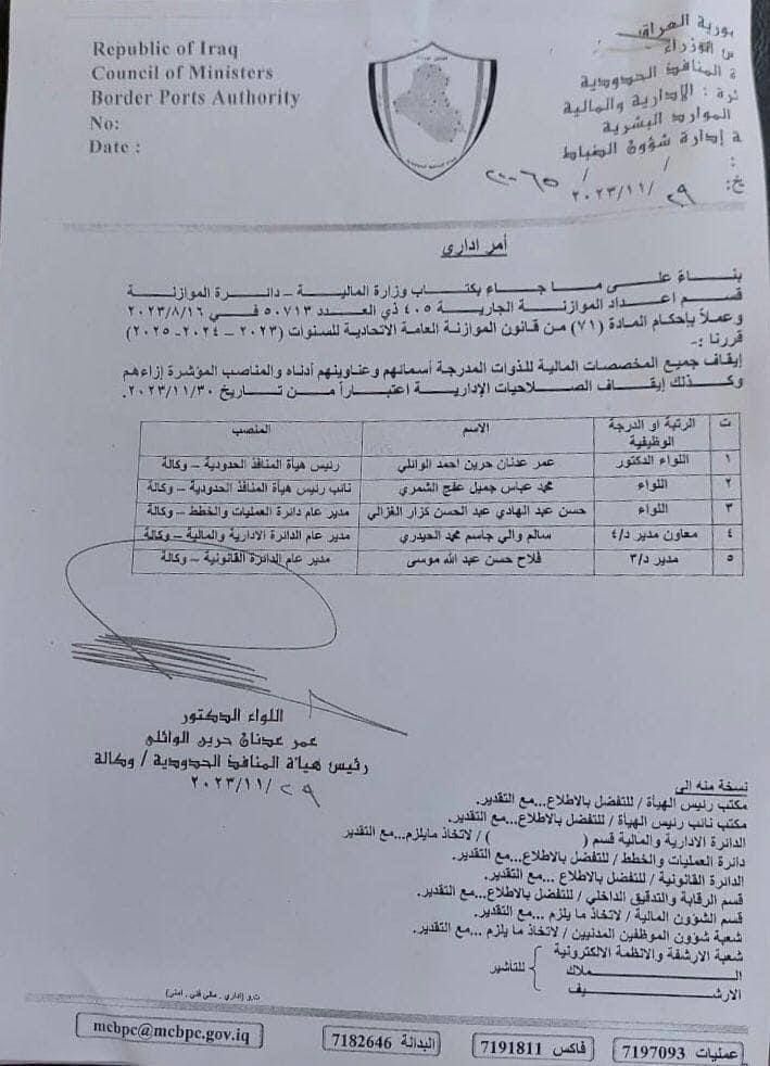 اظهرت وثيقة حصلت الوكالة الوطنية العراقية للانباء /نينا/ على نسخة منها بايقاف الصلاحيات الادارية والتخصيصات المالية لرئيس هيئة المنافذ الحدودية عمر الوائلي وعدد من المسؤولين./