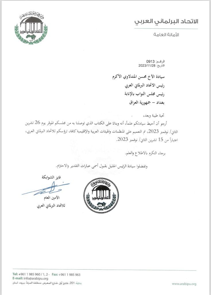 قرر الأتحاد البرلماني العربي تعيين محسن المندلاوي رئيسا له خلفا لمحمد الحلبوسي