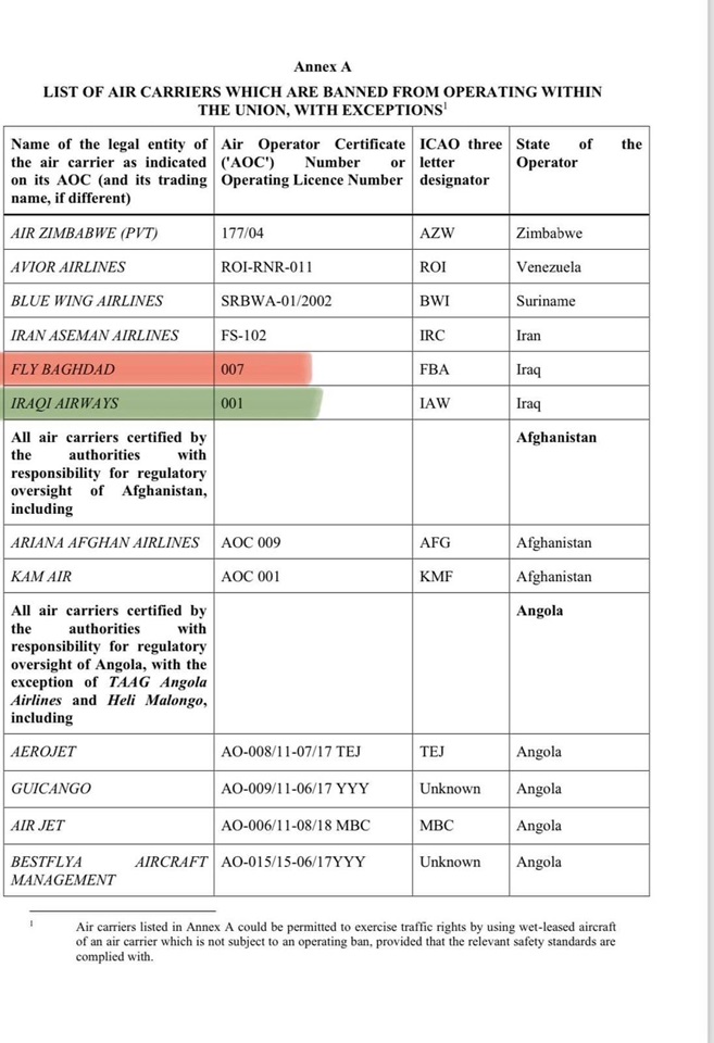 وبحسب وثيقة فان الإتحاد نشر قائمة بشركات النقل الجوي المحظورة من العمل داخل الاتحاد، وجاء من ضمن الشركات المحظورة شركة فلاي بغداد والطيران العراقي".