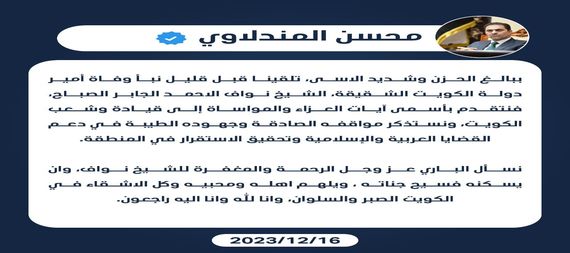 عزى رئيس مجلس النواب بالإنابة محسن المندلاوي الكويت بوفاة أميرها الشيخ نواف الاحمد الجابر الصباح .