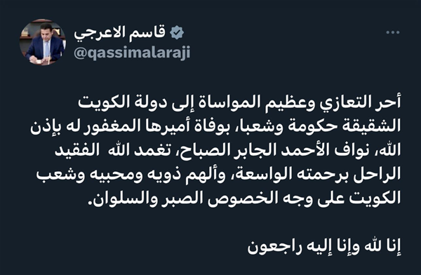قدم مستشار الأمن القومي قاسم الأعرجي، اليوم السبت، التعازي بوفاة أمير الكويت الشيخ نواف الأحمد الصباح.